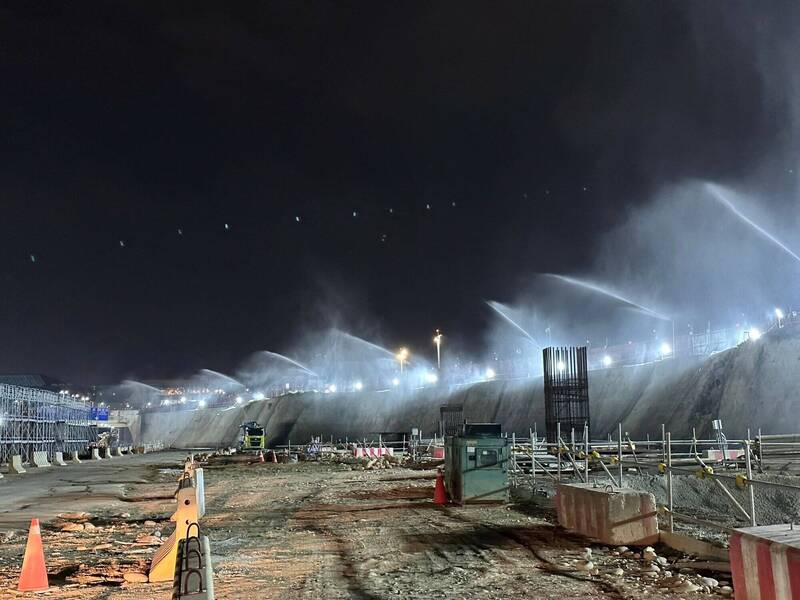 環保局表示,今年度機場工程使用該系統,除解決開挖作業期間及車輛行駛帶來的揚塵空氣汙染問題,也讓工程管理單位即時掌握施工汙染問題及改善成果,並減少人力覆蓋防塵網及灑水車使用,另使用工程排水循環作為灑水水源,採用太陽能發電作為AI感測器能源,提升環保效益。