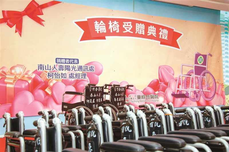 童綜合醫院昨天獲南山人壽陽光通訊處經理柯怡如捐贈30台輪椅,可供醫院患者使用。童綜合醫院副院長吳肇鑫表示,輪椅在醫院使用頻繁,目前醫院每月借用量約2000人次,常需汰舊換新,方便民眾到院就醫看診。