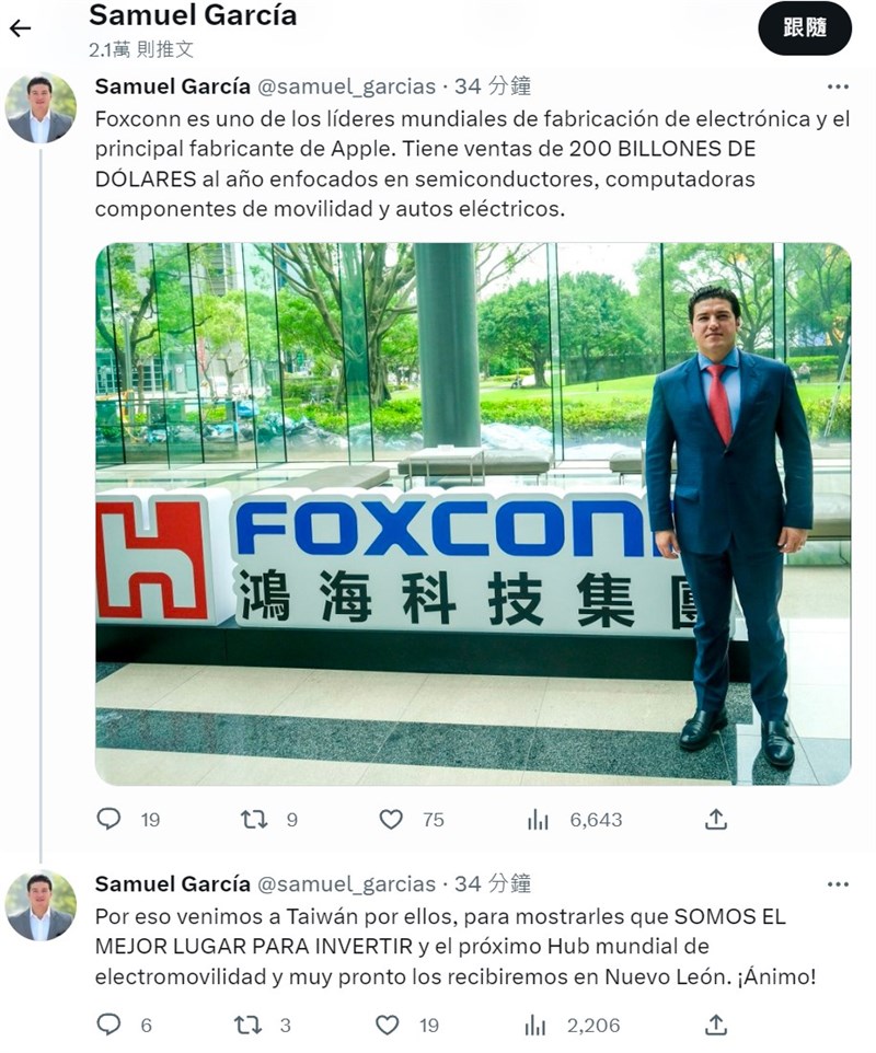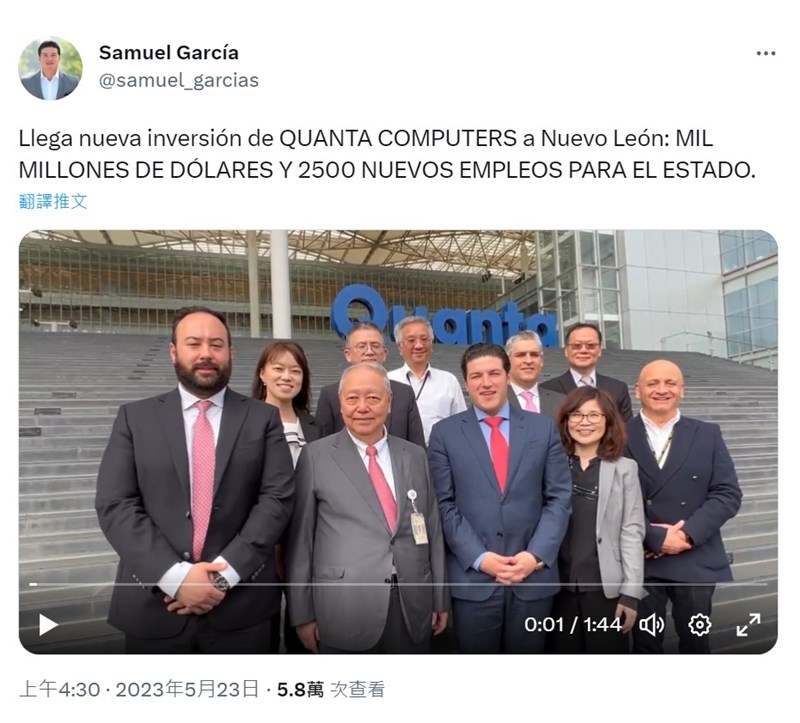廣達將投資墨西哥10億美元 創2500工作機會 |2023.05.23 語音朗讀 840觀看次 字級 大 中 小 墨西哥北部新利昂州州長賈西亞(下排右3),22日在推特發文表示,廣達將在當地投資10億美元,並創造2500個工作機會。圖/twitter@samuel_garcias 【本報綜合外電報導】墨西哥北部新利昂州(Nuevo Leon)州長賈西亞(Samuel Garcia)昨(22日)在推特發文表示,台灣的廣達將在當地投資10億美元(新台幣306億元)並創造2500個工作機會。路透報導,賈西亞在廣達的墨西哥總部新利昂州首府蒙特雷(Monterrey)表示,這項投資反映了近岸生產的潛力,也是新利昂州「經濟繁榮」的跡象。新利昂州政府發言人表示,這是廣達在該州拓展營運的一環。廣達是電動車製造商特斯拉(Tesla)的供應商。特斯拉今年稍早已宣布將在墨西哥第3大城和工業中心蒙特雷斥資50億美元興建新廠。賈西亞今天稍早還會見了鴻海高階主管,並在推特發文表示即將發表「重大宣布」。 前一篇文章 反普亭武裝團體入侵俄邊境 宣稱解放城鎮 下一篇文章 聲量歷年之最 WHA美日英法等支持台灣加入 熱門新聞 01男子氣概照護員 日本長照新力量2026.04.0502租賃車業者違法攬客 觀光署:最高罰200萬元2026.04.0703【無所不知】 北庭故城遺址(上)2026.04.0304【徵稿】2026.04.0305【分數之外】看見另一種英文2026.04.0806美課藥品重稅 台灣沒優惠 2026.04.0407【轉移注意力】往理想中的自己邁進2026.04.0508降雨兩樣情 南部水庫沒解渴2026.04.0609【青春部落】 那一次,我應該這樣說2026.04.0310暴雨狂炸苗栗 災情頻傳 2026.04.05 訂閱電子報 台北市 天氣預報 台灣一週天氣預報 相關報導 打破集體領導 越南總書記兼國家主席阿提米絲2號飛越月球背面 破紀錄江蘇夢幻櫻花河清明假期 陸跨區流動破8億人次陸突設東海飛航管制40天 引猜測阿提米絲2號 將創人類離地球最遠紀錄