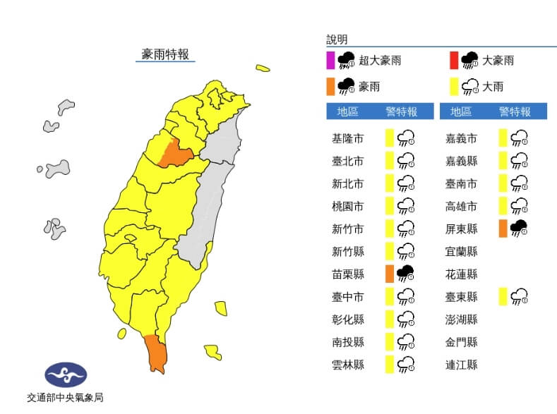 17縣市豪、大雨特報 防雷擊及強陣風 |2023.05.23 語音朗讀 775觀看次 字級 大 中 小 大雨特報,防雷擊及強陣風。圖/中央社 【本報台北訊】中央氣象局今(23日)上午6時20分發布大雨特報,鋒面影響,易有短延時強降雨,恆春半島及苗栗縣山區有局部大雨或豪雨發生,西半部及台東地區有局部大雨發生的機率,請注意雷擊及強陣風;低窪地區請慎防淹水。大雨地區為基隆市、台北市、新北市、桃園市、新竹市、新竹縣、台中市、彰化縣、南投縣、雲林縣、嘉義市、嘉義縣、臺南市、高雄市、台東縣。豪雨地區為苗栗縣、屏東縣。圖/擷取自中央氣象局網頁圖/擷取自中央氣象局網頁颱風瑪娃轉中颱。圖/擷取自中央氣象局網頁 前一篇文章 新聞千里眼 下一篇文章 桃園雷雨強側風5航班轉降 星宇在高雄等天亮 熱門新聞 01陸建匈塞鐵路 塞國段全線通車2025.10.0502全球佛光人 雲端共識和諧和平2025.10.0503埃及熱氣球映門農巨像2025.10.0504以愛育才 20教師獲頒星雲教育獎2025.10.0505菲律賓宿霧強震 佛光人馳援賑災2025.10.0606高市早苗 電視台主播邁向首相寶座2025.10.0507虎頭埤風景區 推動纜車BOT案2025.10.0508心保和尚闡述《八大人覺經》修行是生命最好的投資 2025.10.0509【修行在人間】佛心的慈視52025.10.0510【人間行者心】感恩茶會 一場殊勝的相遇2025.10.05 訂閱電子報 台北市 天氣預報 台灣一週天氣預報 相關報導 金博大金磚 身價近9億元輝達進駐北士科 可專案設定地上權 納堰塞湖整治 加速花蓮重建 特別條例增至850億元熊猴森樂園 親子最愛光復應變新規 2層住戶垂直撤離連40天超種亮紅燈 高麗菜價恐跌