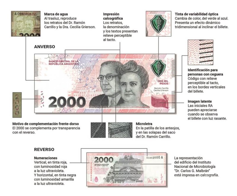 阿根廷央行表示,2000披索新鈔針對防偽做了更多設計,例如使用光變型油墨印刷、透光人頭浮水印、微縮印刷,更為了便利視障人士辨識,設計浮雕觸摸設計。