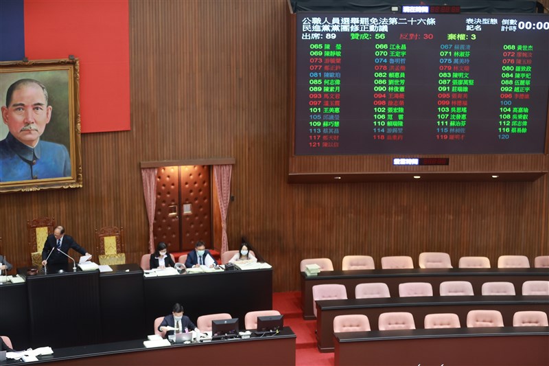 立法院會今天下午處理選罷法修法新增「排黑條款」,其中備受爭議的犯洗防法判決確定者、判十年以上刑度尚未定讞者不得參選,經院會表決,贊成56人、反對30人、棄權3人。值得一提的是,民進黨立委劉櫂豪、余天、楊曜、陳歐珀、邱議瑩及無黨籍黃國書、蘇震清等人未參與表決。