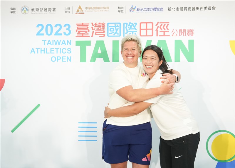 沃達奇克跟余雅倩在台灣國際田徑公開賽前相擁互相打氣。圖/田協提供