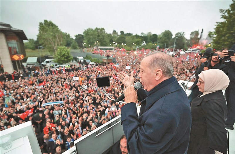 土耳其總統大選決選結果出爐,厄多岡當選。圖為他28日在伊斯坦堡向眾多支持者發表勝選感言。圖/法新社