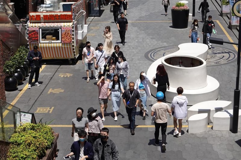 上海吳江路步行街散步民眾用手遮擋太陽。圖/中新社