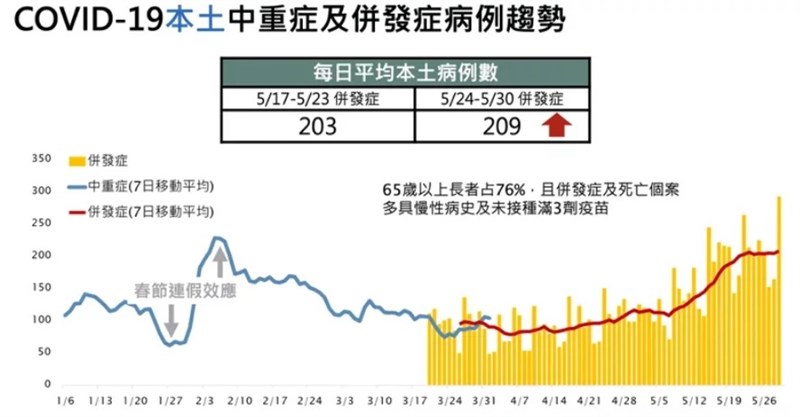 疾管署公布,自3/20新制實施後,近7日每日平均新增209例,較前7日每日平均新增203例上升;5月起本土併發症累計4904例,未打滿3劑疫苗有2416例(約49%),其中又以未曾接種任何一劑疫苗者約70%為多(1684例)。