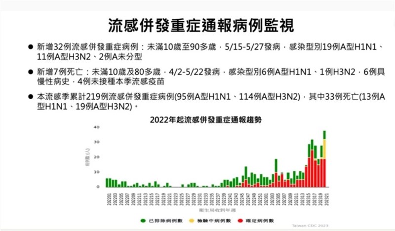 另新增7例死亡,年齡為未滿10歲及80多歲,為3例男性、4例女性,發病日介於4月2日及5月22日,其中6例分別有糖尿病、高血壓、心血管疾病、肝臟疾病、腎臟疾病、失智等慢性病史,4例未接種本季流感疫苗。