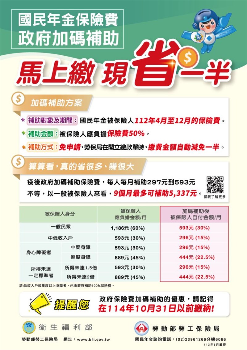勞保局提醒,今年4月至12月份國保保險費,被保險人會在5月、7月、9月、11月及明(民國113年)年1月底陸續收到繳款單,請記得最晚要在民國114年10月31日以前繳納,才可享有政府加碼補助一半保險費的優惠,且繳納保險費可累積國保年資,保障未來老年基本生活。