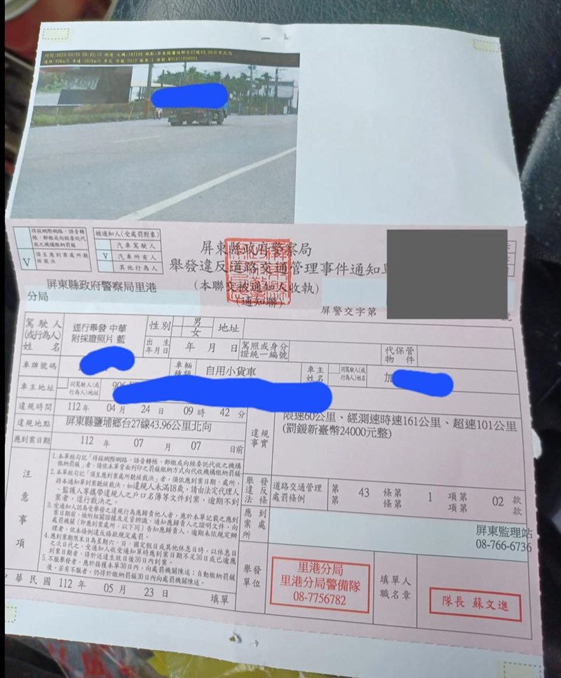 里港警分局表示,避免超速造成交通事故,警方不定時不定點執法測速,經查測速儀經標檢局檢驗合格,測速儀照相測得上述時速無誤,惟為求公平審慎,將請民眾攜違反道路交通管理事件通知單(紅單)影本及行照等相關佐證資料至里港警分局陳述。