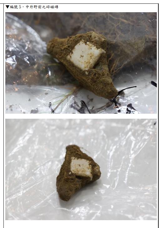 市議員宋品瑩向市府調閱資料赫然發現,5月31日在棒球場隨機開挖7處、30公分見方土層,並下挖10到20公分,其中就有6處明顯不符土壤級配,挖取出的異物不只是大石頭而已竟然還含有「磁磚碎片」,依契約規定,棒球場土層10公分至20公分,土壤級配應只能有土跟沙而已,為何存在磁磚?