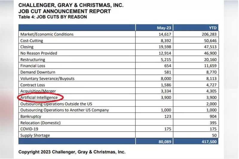 該公司1日公布報告指出,美國企業5月宣告裁員人數為41萬7500人左右,為去年同期的4倍以上。報告並列出縮減人力的理由,AI似乎首次上榜,有3900人因此丟掉飯碗。