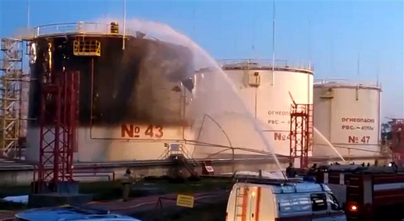 5月31日,俄羅斯克拉斯諾達爾州當地1座煉油廠也遭到無人機襲擊,導致火災發生。圖/美聯社