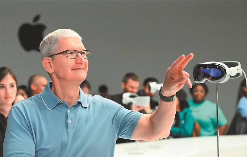 蘋果公司5日於美國舊金山舉辦WWDC全球開發者大會,執行長庫克發表全新擴增實境(AR)頭戴裝置Vision Pro。圖/法新社