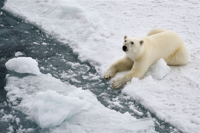 氣候變暖導致北極快速融冰,圖為浮冰上的一頭北極熊。圖/美聯社