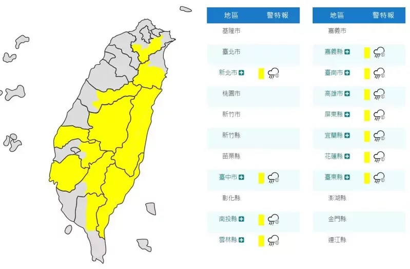 大雨特報範圍包括新北市山區、台中市山區、南投縣、雲林縣、嘉義縣山區、台南市、高雄市山區、屏東縣山區、宜蘭縣山區、花蓮縣、台東縣,共11縣市。