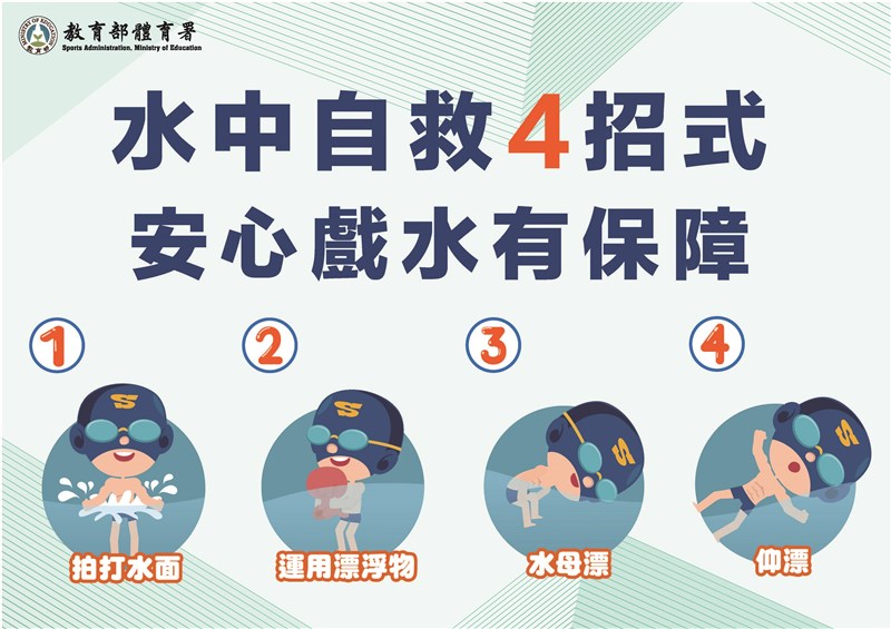 【記者曾博群台北報導】教育部體育署為強化學生游泳和水中自救能力,特地修正「全國中、小學學生與自救能力基本指標」,並希望校方在暑假開始前加強水域安全宣導,並呼籲學生熟練「水中自救」4招。