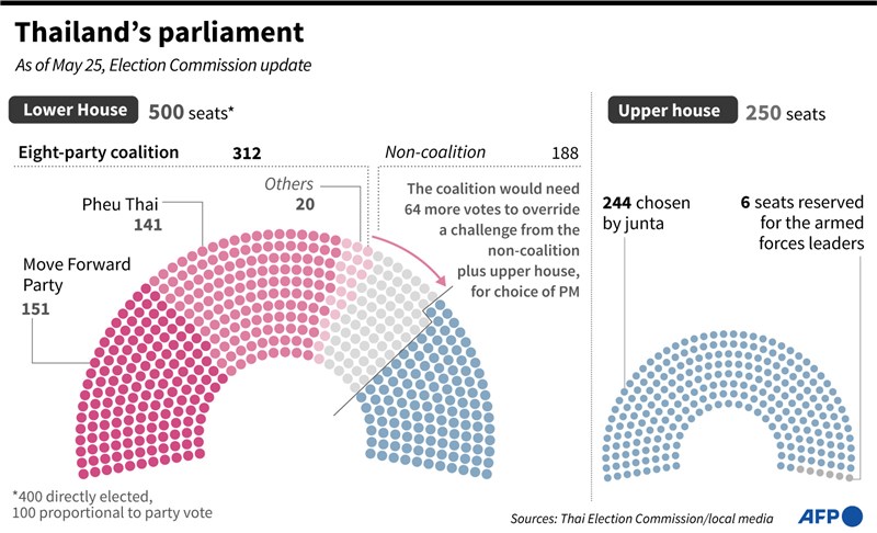 不過8黨聯盟能不能順利執政仍有變數,因為總理候選人必須有參眾兩院750席過半數,也就是376席支持,但參議院250席幾乎為親軍方勢力,且多數尚未表態。
