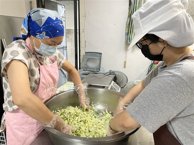 家扶媽媽用雙手把水餃餡料攪拌均勻。圖/南台中家扶提供