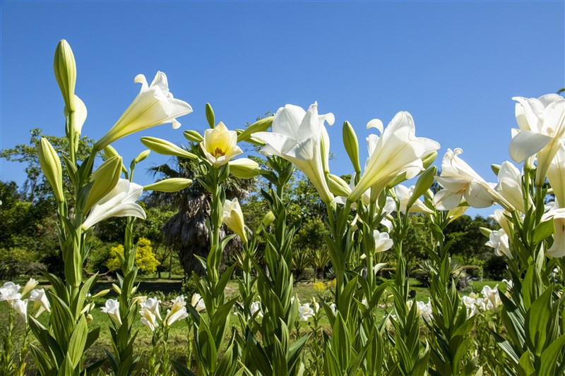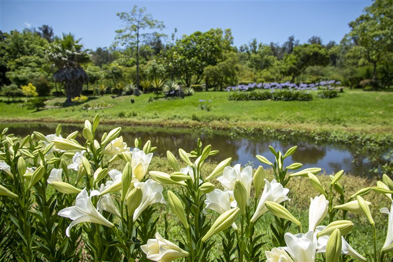 今年植物園生態河道旁的白天堂鐵炮百合,有標誌性的喇叭型花朵,香味清幽淡雅,近日天氣好,百合花已有花朵爆發的趨勢,花期約2周歡迎踴躍民眾前往賞花。。