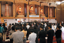 西來寺二十一日舉行「為五一二中國四川大地震哀悼法會」,南加州佛教聯合會主席佘紹漢、副主席張素久、南加州和統會范允富、哈崗拉朋地聯合學區教委徐乃星等逾兩百人,以一瓣瓣心香,伴隨一聲聲佛號,共同為四川大地震罹難民眾與受難災民誦經祈願。住持慧濟法師以「無常才會無我」、「慈悲可以創造奇蹟」開示大眾。(人間社記者張志誠攝)