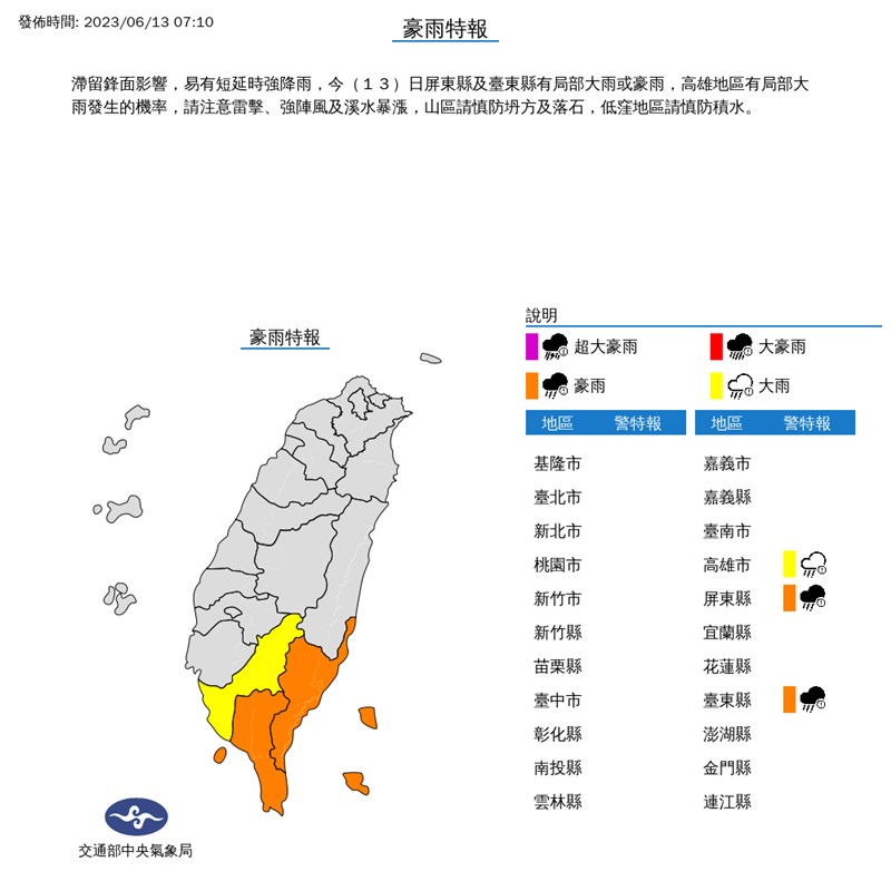 滯留鋒面徘徊 南部降雨持續 |2023.06.13 語音朗讀 637觀看次 字級 大 中 小 滯留鋒面徘徊,13日中南部及台東有短暫陣雨或雷雨,南部降雨比較持續。圖為高雄市區。圖/資料照片 【本報台北訊】中央氣象局表示,滯留鋒面徘徊,今(13)日中南部及台東有短暫陣雨或雷雨,南部降雨比較持續;北部及宜蘭、花蓮雨勢較零星,午後有局部短暫雷陣雨;氣溫方面,各地高溫預測約28至32度。氣象局提醒,天氣不穩定,易有短延時強降雨,並有局部大雨或豪雨發生機率,外出活動應留意天氣變化,建議攜帶雨具備用。氣象局表示,各地高溫預測約攝氏28至32度,低溫約25、26度。恆春半島及蘭嶼將有8至9級強陣風,鄰近海域並有較大風浪,海域活動請注意安全。圖/取自中央氣象局官網氣象局指出,今年第3號輕度颱風谷超,清晨2時已變性為溫帶氣旋,中心位在東京南南東方470公里海面上,對台灣天氣沒有影響。根據環保署空氣品質預報資訊,今(13)日受滯留鋒面徘徊影響,全台降雨機率增加,受降雨洗除作用影響,空品多為良好至普通等級。竹苗、雲嘉南、高屏、宜蘭、花東空品區及澎湖為「良好」等級,雲嘉南零星地區短時間可能達普通等級,北部、中部空品區及馬祖、金門為「普通」等級。圖/取自報天氣 - 中央氣象局臉書 前一篇文章 新聞千里眼 下一篇文章 美MIT「觀看之道」整合數位科技與手繪 記錄阿富汗珍貴遺址 熱門新聞 01【分數之外】看見另一種英文2026.04.0802男子氣概照護員 日本長照新力量2026.04.0503【轉移注意力】往理想中的自己邁進2026.04.0504降雨兩樣情 南部水庫沒解渴2026.04.0605美課藥品重稅 台灣沒優惠 2026.04.0406一紙學歷換錢景 美學位價值遭質疑2026.04.0507【深頁凝視】《後院的鳥》凝神注視鳥兒登場2026.04.0508租賃車業者違法攬客 觀光署:最高罰200萬元2026.04.0709MLB鄧愷威拆彈 守住今井旅美首勝2026.04.0610暴雨狂炸苗栗 災情頻傳 2026.04.05 訂閱電子報 台北市 天氣預報 台灣一週天氣預報 相關報導 15%小琉球海龜曾受傷 癒合均需1年半古坑桐花季 18日浪漫登場清明豪雨 合歡溪出現新堰塞湖火金姑故鄉 賞螢好去處計程車掛牌費喊到35萬元 交部出手塑膠袋之亂 中南部缺貨嚴重
