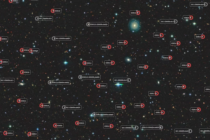 圖為本次發布數據中的一小部分,每個紅圈都代表一顆恆星,點進去可看到大量天文訊息。圖/DESI Legacy Imaging Survey, D. Lang(Perimeter Institute)提供