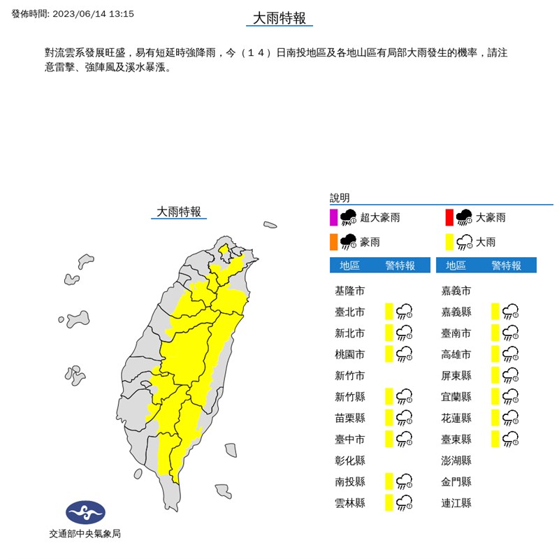 大雨特報範圍包括台北市山區、新北市山區、桃園市山區、新竹縣山區、苗栗縣山區、台中市山區、南投縣、雲林縣山區、嘉義縣山區、台南市山區、高雄市山區、屏東縣山區、宜蘭縣山區、花蓮縣山區、台東縣山區,影響時間從下午至晚上。