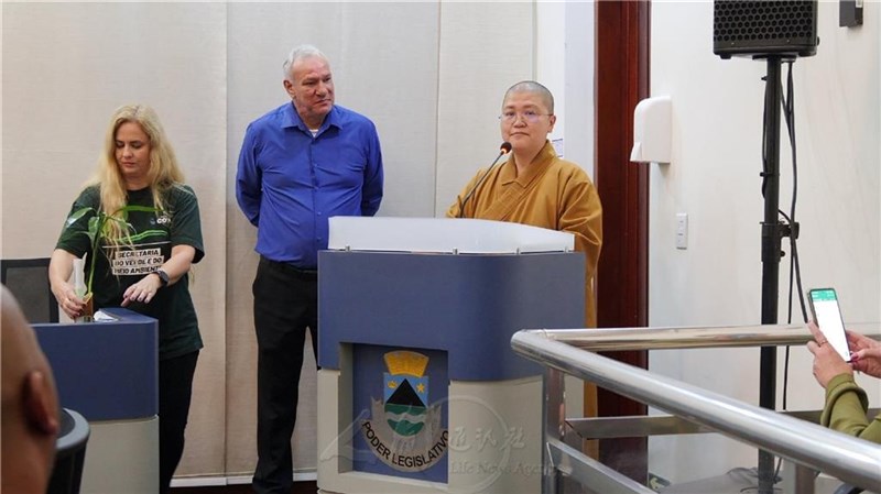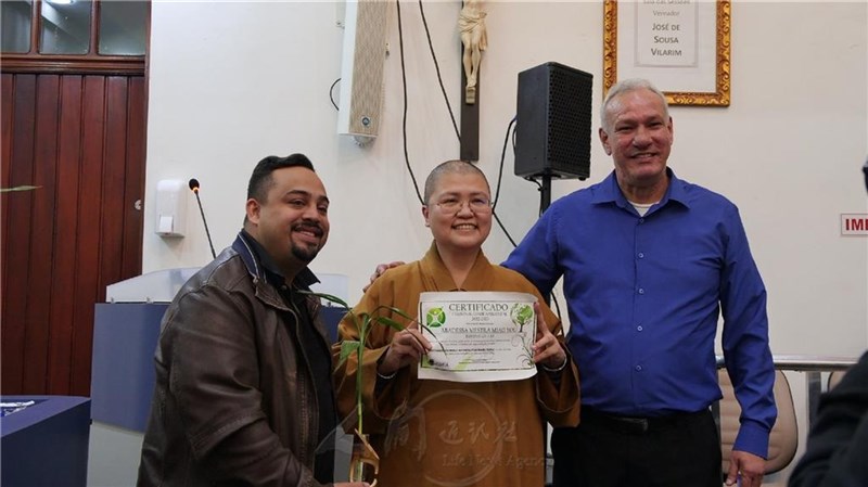When receiving the award, Venerable Miao You expressed gratitude to the city government for recognizing the environmental efforts of I.B.P.S. Do Brasil and Buddha's Light International Association (BLIA) Brazil. Venerable Miao You emphasized that this award belongs to all Brazilian Fo Guang members, and they will continue to promote the environmental and spiritual preservation principles of Venerable Master Hsing Yun, awakening people's awareness of environmental protection.