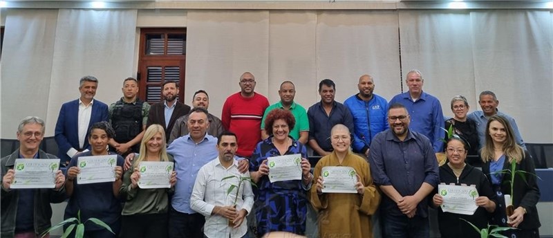 Certificates of recognition were presented by the authorities to seven groups and individuals who have made contributions to environmental initiatives. The recipients include Venerable Miao You, Abbess of I.B.P.S. Do Brasil, Angela Maluf, Samantha, the Secretary of the Education Bureau, Marly, the head of Coopernova recycling plant, the Brazilian branch of Symrise International, a factory specializing in essential oils and cosmetic ingredients, Luxo de Lixo, a garbage recycling and sorting company, and Preserva Recicla, an oil recycling company.