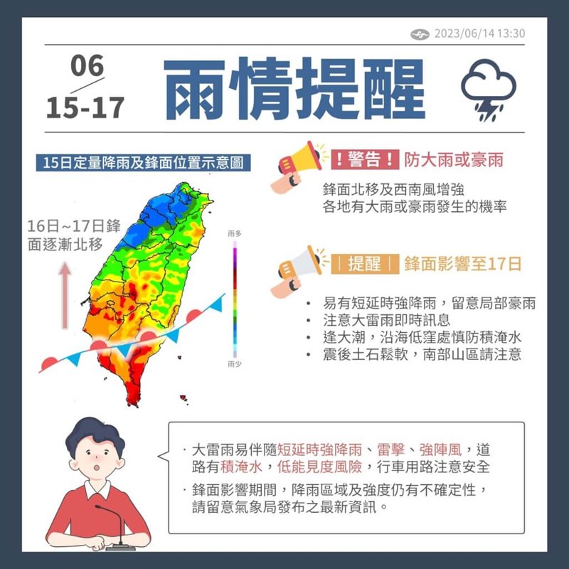 中央氣象局預報員陳伊秀表示,明天至17日滯留鋒面逐漸向北移動,加上西南風增強,各地易有短延時強降雨,並有局部大雨或豪雨發生的機率。