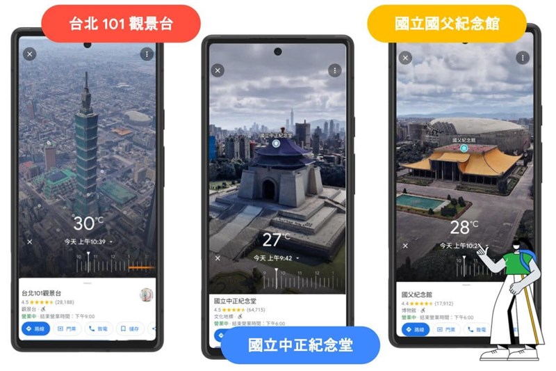 【本報台北訊】Google今年5月在I/O開發者大會展示「沉浸式實景」地圖功能,今(15)日正式推廣到全球500多個景點,其中台灣有9個熱門地標同步更新。