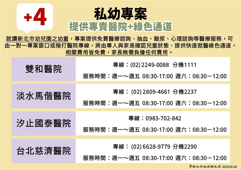 新北8間醫院供諮詢服務 並稽查23間幼兒園 |2023.06.16 語音朗讀 899觀看次 字級 大 中 小 新北私立幼兒園疑餵藥案延燒,教育局16日表示,全面稽查新北幼兒園,落實園務並做好親師生溝通。圖/資料照片 【本報新北訊】新北私立幼兒園疑餵藥案延燒,教育局今(16)日表示,全面稽查新北幼兒園,落實園務並做好親師生溝通。新北市長侯友宜於市府私幼案說明記者會中宣布,汐止國泰醫院、淡水馬偕醫院、台北慈濟醫院及雙和醫院,加入私幼專案醫療團隊服務,目前新北市8家醫院提供服務,守護幼兒健康。新北市衛生局說明,今(16)日衛生局再增加汐止國泰醫院、淡水馬偕醫院、台北慈濟醫院及雙和醫院,8家醫院提供全市幼兒園幼童醫療諮詢、抽血、驗尿、心理諮詢等醫療服務,相關費用皆免費,家長無需負擔任何費用。為協助新北家長們平息疑慮,只要是在新北市內幼兒園的幼童,家長可撥打各家醫院諮詢專線,將由專人與家長確認兒童狀態、免費提供快速就醫綠色通道。非醫院服務時段,家長如有任何問題,亦可撥打教育局專案辦公室及專線電話協助安排(02-2956-0885)。圖/取自新北市政府衛生局新北地檢署已發布新聞稿表示,對於有民代在電視節目提到「監視器畫面被刪除、檢警還原監視器畫面」一事,絕對無此事,請各界不要揣測案情。新北市副市長劉和然表示,案件仍由司法偵辦,檢察官釐清中,教育局於5月15日接獲投訴不當對待案,同步啟動司法與行政處理,沒有延誤。另外,市府清查2.3萬通電話,絕無家長4月報案幼兒園不當管教一事。教育局長張明文表示,幼兒園行政稽查本來就是常態性業務,鑑於板橋疑餵藥案、汐止尿檢案受關注,已全面稽查新北幼兒園。張明文表示,疑餵藥案爆發後,6月8及9日稽查新北市的吉的堡機構23間幼兒園,除1家未裝設監視器,其餘逐一要求攝錄資料應保存至少14天,未依規定保存者,已督導改善並納入稽核重點項目。教育局統計,這23間吉的堡連鎖幼兒園,共查獲11間違規,大多為收據未留園備查、餐點未留樣、採分科教學等,已處負責人新台幣6000元以上、6萬元以下罰鍰,並命令限期改善。教育局表示,已要求吉的堡總公司負起企業社會責任,多次邀總公司人員開會或到場討論,要求督導轄內23家連鎖幼兒園,將來若經檢方調查確實有不當餵藥,將要求總公司負起賠償責任。教育局專案辦公室服務時間:平日17:00-21:00、假日10:00-21:00;教育局24小時專線電話:(02)2956-0885。新北市私幼專案【土城醫院】專線:(02)2263-0588 分機2109服務時間:周一至周五 08:30-17:00、周六08:30-12:00【亞東醫院】專線:(02)8966-7000分機1148服務時間:周一至周五 08:30-17:00、周六08:30-12:00【市立聯合醫院】(三重院區)專線:0978-695-379服務時間:周一至周五 08:00-17:00、周六08:30-12:00【雙和醫院】專線:(02)22490088分機1111服務時間:周一至周五08:30-17:00、周六08:30-12:00【淡水馬偕醫院】專線:(02)2809-4661分機2237服務時間:周一至周五 08:30-17:00、周六08:30-12:00【汐止國泰醫院】專線:0983-702-842服務時間:周一至周五 08:30-17:00、周六08:30-12:00【台北慈濟醫院】專線:02-6628-9779分機2290服務時間:周一至周五08:30-17:00、周六08:30-12:00【部立台北醫院】專線:(02)2276-5566分機2536服務時間:周一至周日 08:00-17:00圖/取自新北市政府衛生局 前一篇文章 5月海溫破紀錄 全球暖化將更明顯 下一篇文章 籃球/亞運vs.世大運 BE HEROES經典賽7月開戰 熱門新聞 01【詩】草螟公2025.12.1802【閃文集】火星暗斑之謎2025.12.1603福建艦航經台海 空拍照首曝光2025.12.1804高雄新航線明啟動 佛光山成亮點2025.12.1705如何優雅不濺水花?2025.12.1606寶塔寺 三代同堂搓湯圓、繪燈籠2025.12.1607受星雲大師啟發 旅日名廚獲頒黃綬褒章2025.12.1608資助流浪漢之家 里斯本佛光人跨文化送暖2025.12.1809社論--改變與改變的能力2025.12.1610多倫多佛光山龍獅團 中華文化薪火相傳2025.12.18 訂閱電子報 台北市 天氣預報 台灣一週天氣預報 相關報導 鄭麗文訪佛光山 找到歡喜信心全台首座螺旋圓環憲訴法修正案 憲法法庭判違憲吳豊山辭海基會董座 賴聘任資政涉貪無罪 高虹安今復職上班高虹安二審逆轉 貪汙無罪