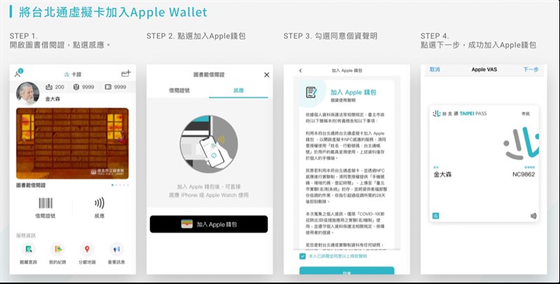 資訊局表示,為強化台北通App虛擬圖書借閱證的安全性及便利性,台北通率先採用Apple Wallet的無線通訊(NFC)技術,民眾透過Apple Wallet取用NFC虛擬圖書借閱證,在77處市立圖書館就可用簡單、安全又隱密方式進行借閱服務。