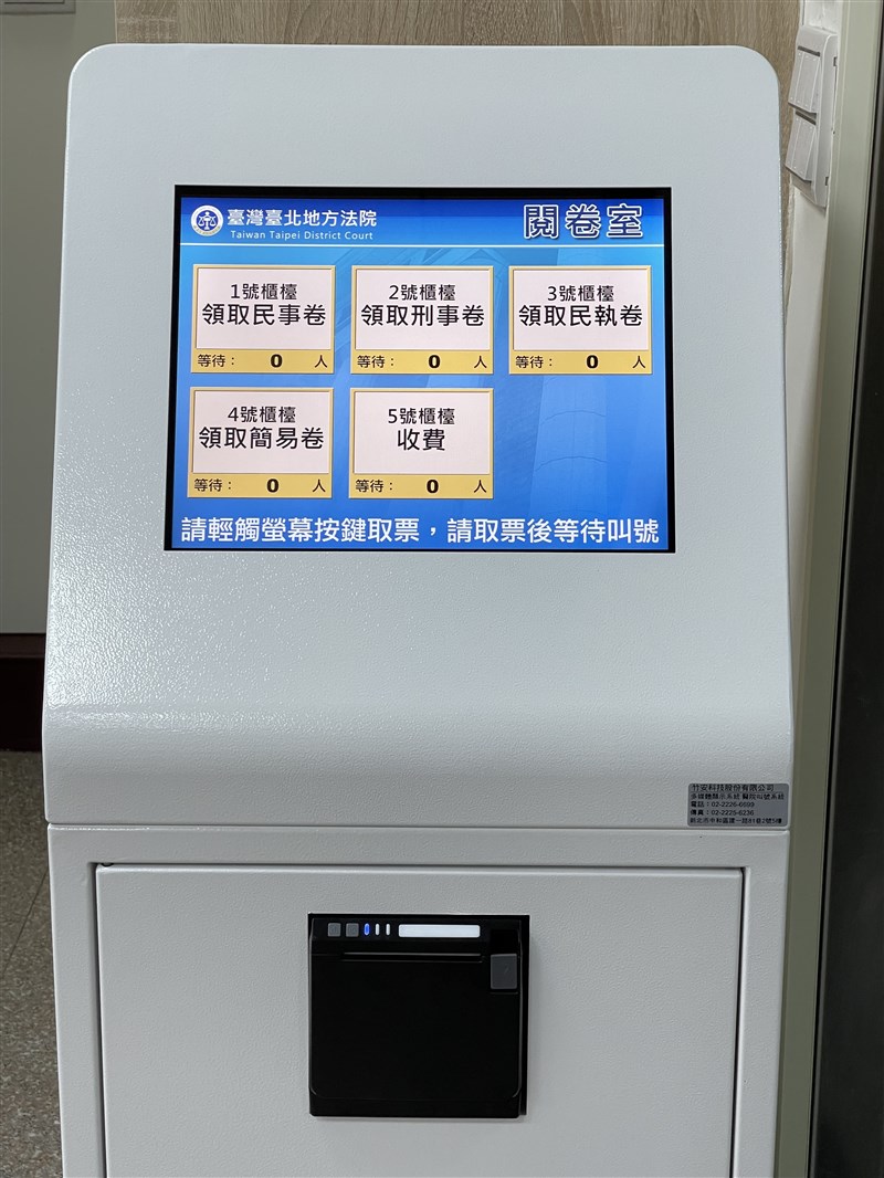 台北地院今(17)日新聞稿指出,日前於法院閱卷室規畫落地式觸控取票機供洽公民眾取票,配合壁掛液晶顯示器及多媒體播放軟體,除顯示各項業務目前等待人數及叫號進度,也可播放宣導圖片、影片及跑馬燈,能快速、有效傳達閱卷資訊,並搭配國語、台語自動播音系統,使服務項目更為廣泛、貼心。
