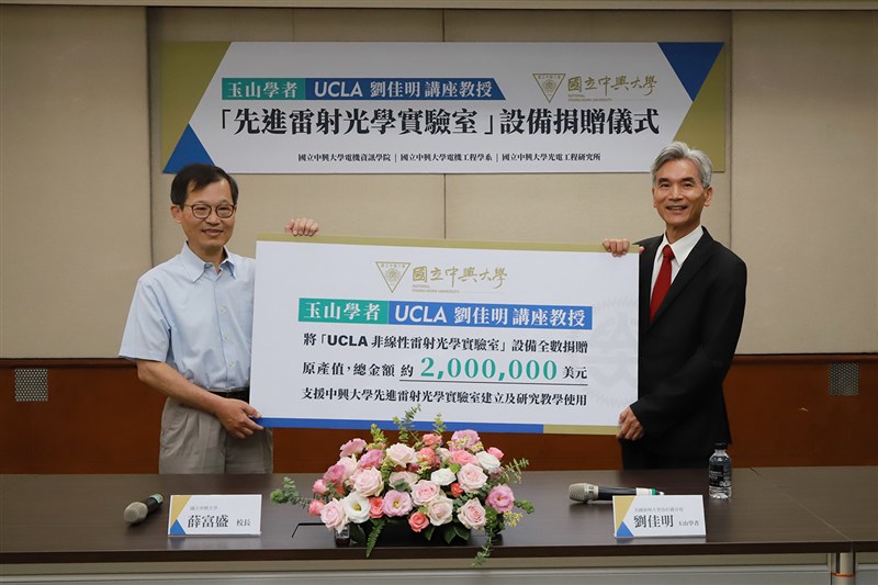 美國加州大學洛杉磯分校(UCLA)工學院副院長暨興大玉山學者劉佳明講座教授(左),捐贈31套先進雷射光學設備給中興大學。圖/中興大學提供