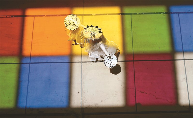 克里斯多福.詹尼的日光雕塑作品〈Passing Light〉,裝置在美國德州聖安東尼的聖安東尼國際機場中,〈Passing Light〉結合嵌在天花板的大型有機玻璃方塊,每年夏至投影時,顏色格跟繪製格會重疊不到一分鐘。圖為凱瑟琳.希斯內羅絲二十一日在〈Passing Light〉的發光方塊上表演。圖/美聯社