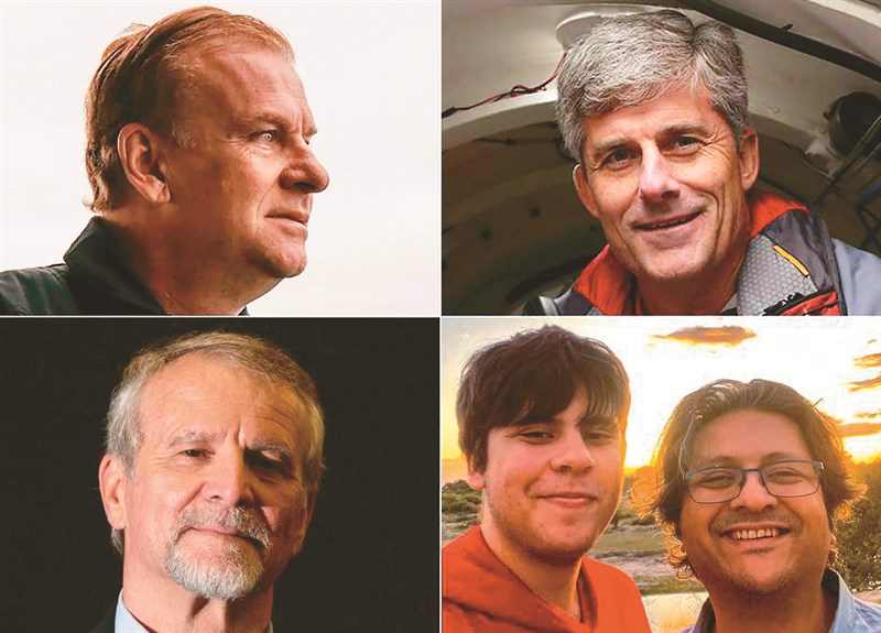 美國海岸防衛隊在當地時間22日表示,發現泰坦號可疑殘骸,5名乘客分別是英國億萬富豪暨探險家哈丁(左上)、「海洋之門探險」執行長拉許(右上)、法國海洋學家納若萊(左下)、英籍巴基斯坦裔富商達伍德與兒子蘇里曼(右下)據信都已喪命。圖/法新社