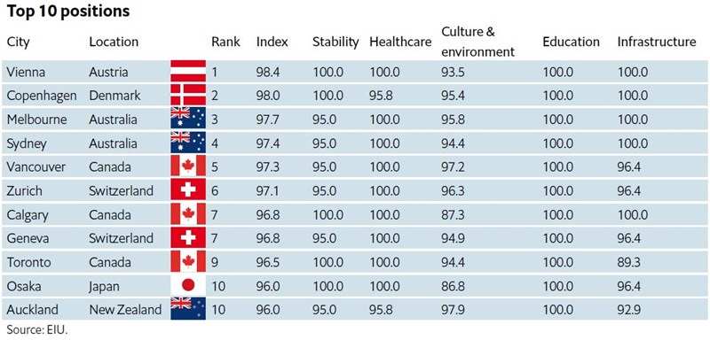 2023全球宜居城市排名 維也納蟬聯榜首 |2023.06.24 語音朗讀 14956觀看次 字級 大 中 小 經濟學人智庫2023年「全球宜居城市排行榜」出爐,由奧地利首都維也納蟬聯榜首。圖為維也納國立歌劇院。圖/取自Wiener Staatsoper臉書 【本報綜合外電報導】經濟學人智庫(EIU)2023年「全球宜居城市排行榜」(Global Liveability Index)出爐,由奧地利首都維也納蟬聯榜首,丹麥哥本哈根位居第2位,澳洲墨爾本及雪梨分別排第3位和第4位,加拿大溫哥華排第5位;日本大阪及與紐西蘭奧克蘭齊居第10位,大阪也是榜單十大中的唯一亞洲代表。綜合媒體報導,全球宜居城市榜單由經濟學人智庫編制,今年涵蓋的城市由140個擴大至173個,主要從穩定、醫療保健、文化和環境、教育、基建5方面、共30個項目評分,每年發表全球宜居指數。經濟學人智庫2023年「全球宜居城市排行榜」出爐。圖/取自Global Liveability Index官網維也納今年在5個評分項目中4個奪得100分,包括教育、健康、基建及穩定性;前10名中有3座城市位於加拿大,是最大贏家,澳洲和瑞士各有2座城市進入前10。香港今年在全球173個城巿中排名61位,較去年升13位,屬於年內名次上升幅度最高的十大城市之一。EIU指出,香港在宜居城市排名上升,主要受惠於解除限疫限制,使生活質素和宜居程度明顯改善。香港今年在全球173個城巿中排名61位,較去年升13位,屬於年內名次上升幅度最高的十大城市之一。圖/香港中通社EIU表示,得益於新冠疫情緩解,令醫療保健、教育及文化指數齊升,全球平均分升至15年來新高,「教育制度更強壯,學生返回校園,醫療系統負荷減輕,以及中東和亞洲開發中國家的經濟發展,都是今年排名的重要現象」。儘管歐洲城市占了排行榜前10名的多數,但有更多歐洲大城市排名暴跌;英國倫敦由去年第12名跌至第46名,瑞典斯德哥爾摩從第22名跌至第43名。此外,這項排名倒數十座城市,包括吊車尾的敘利亞大馬士革,受俄國入侵的烏克蘭首都基輔,以及政治長期不穩定的利比亞首都的黎波里等。排名倒數的城市包括受俄國入侵的烏克蘭首都基輔。圖/美聯社 前一篇文章 日本新版紙鈔 最快2024年7月發行 下一篇文章 新冠疫情暫緩 印尼取消159國家免簽 熱門新聞 01補充纖維、鈣、鎂、鉀 預防多種疾病風險2025.11.1102印尼佛教大學、佛光山叢林學院 簽MOU2025.11.1203【遊藝筆記】 天涯海角一坡翁2025.11.1104多倫多佛光山 獲頒建築文化遺產獎2025.11.1205攝影師造池塘 重建沙漠生機2025.11.1106比利時國小師生 靜坐、抄心經2025.11.1107【臆想截圖】 蔥蘭今生與來世2025.11.1108【論愛談情】愛,無須卑微2025.11.1109修行入廚慈悲入味 台韓寺剎飲食交流2025.11.1210鳳凰颱風來襲 桃園、宜花、澎湖今停班停課2025.11.11 訂閱電子報 台北市 天氣預報 台灣一週天氣預報 相關報導 中日緊張 陸4海警船巡航釣魚台空靈線條 示警汙染印尼村落慶典 噴火表演吸睛警告日本 陸黃海軍演、籲暫勿遊日 墨西哥熱氣球節 高空爭豔神舟21號 成功返地球