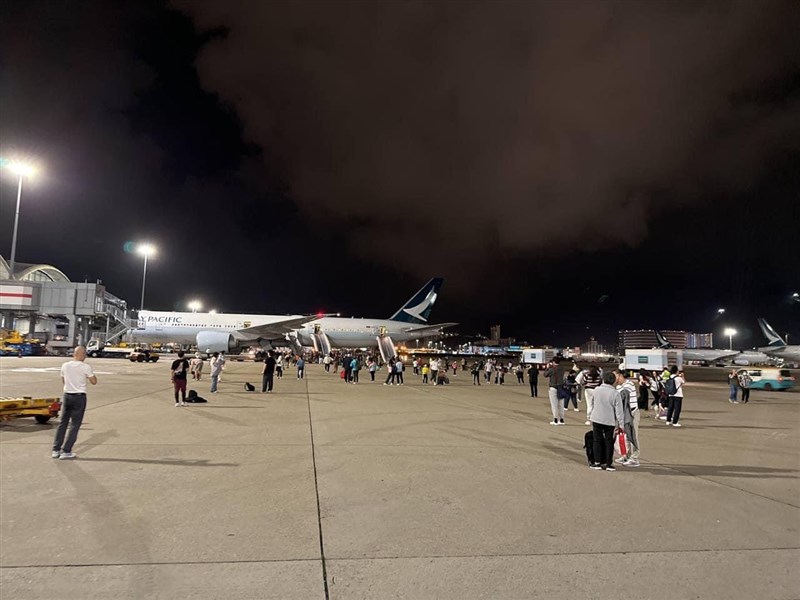 香港機場管理局24日約凌晨0時20分接獲報告,1架原預定飛往美國洛杉磯的國泰航空CX880客機,因機組人員偵察到「技術故障」,緊急中止起飛並折返登機口,讓乘客經逃生滑梯離開,卻造成11名乘客於逃生時受傷。圖/取自推特@JacdecNew