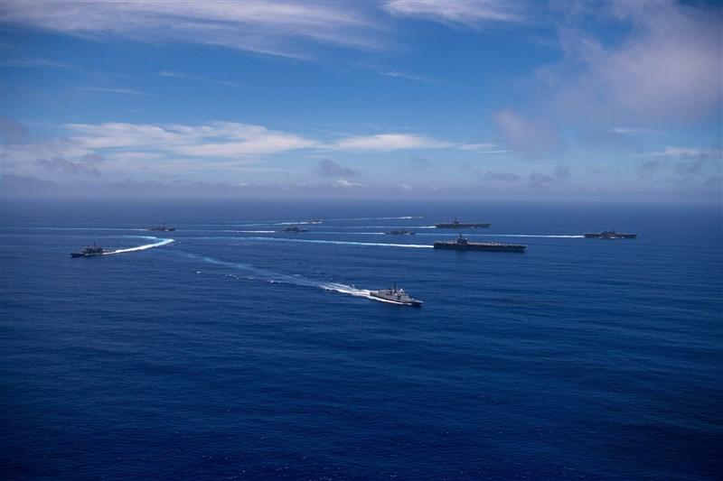 雷根總統基金會暨研究所民調,56%美國人表示支持美軍在台灣周圍加強軍事部署,以阻止共軍犯台。圖為美航母群。圖/FB 7thfleet