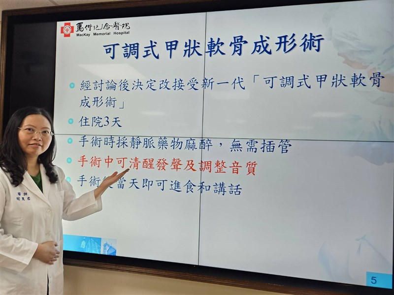 馬偕醫院耳鼻喉頭頸外科系喉科主任謝麗君表示,新一代可調式甲狀軟骨成形術,具有手術時間短、術中可即時調整、及術後門診接受微調等特點,是飽受「消音」困擾者的治療新選項。