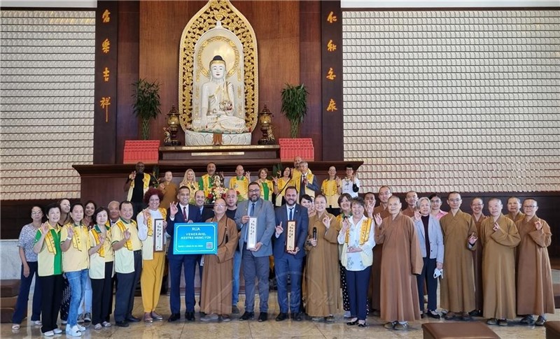 Venerable Hsin Bao took a photo with officials in front of Venerable Master Hsing Yun's bronze statue. photo/The Life News Agency