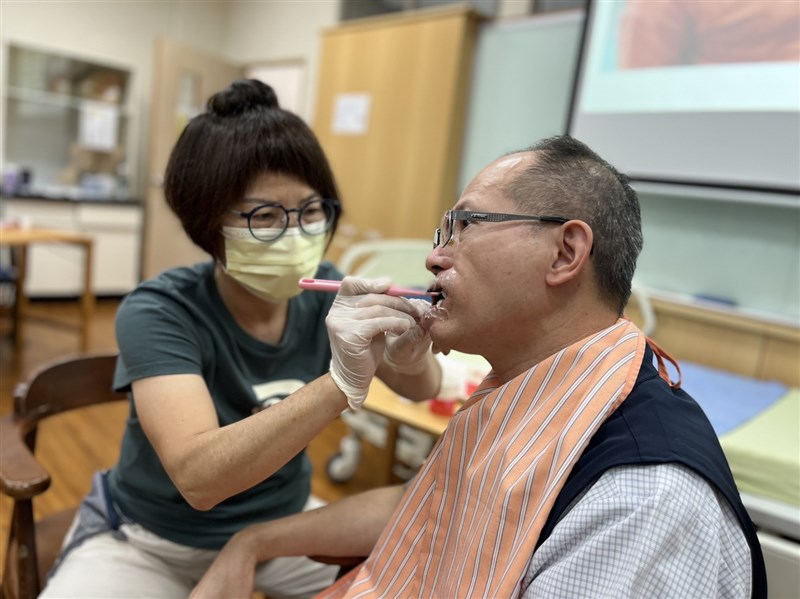 台中市政府社會局副局長陳坤皇,親臨現場體驗口腔乾燥照護。圖/永信社福基金會提供