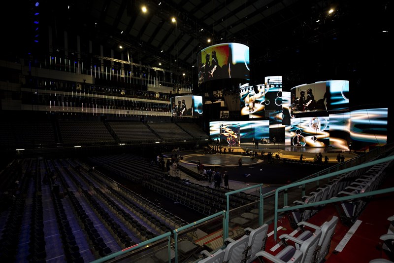 整座小巨蛋,除了舞台上方的LED螢幕充滿圓圈設計外,典禮舞台地板更打破以往都是平面的設計,設計了高低差的圓圈區域;天上LED螢幕更突破舞台的鏡框區域,往前延伸至特區的天花板上,讓整座舞台看起來既有浮空感,從正面看來地面搭配天上更有著漣漪一圈一圈的特殊視覺感,完全突破舞台與觀眾席的概念。