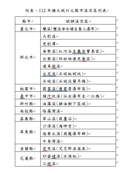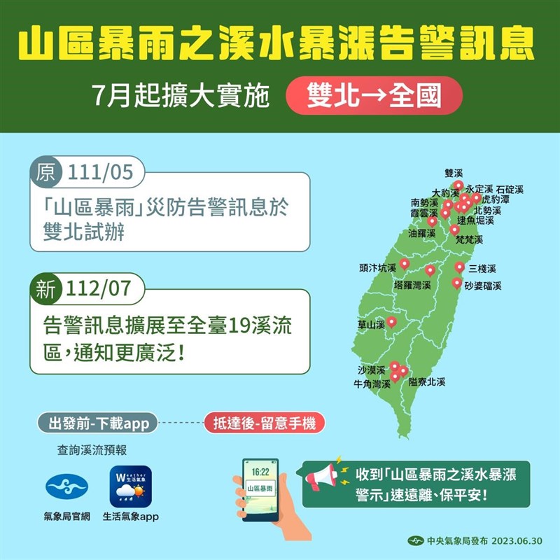 氣象局指出,今年夏季起擴大試行範圍,涵蓋全台19個溪流活動區域,7月起每日定時發布溪流區天氣預報,方便民眾行前至該局官網「生活-休閒旅遊預報專區」查詢天氣資訊。當溪流區及其上游山區有暴雨發生可能時,將即時發布預警,並發送PWS「山區暴雨之溪水暴漲警示訊息」至該溪流區,提醒民眾避免於溪流及河床從事遊憩活動。