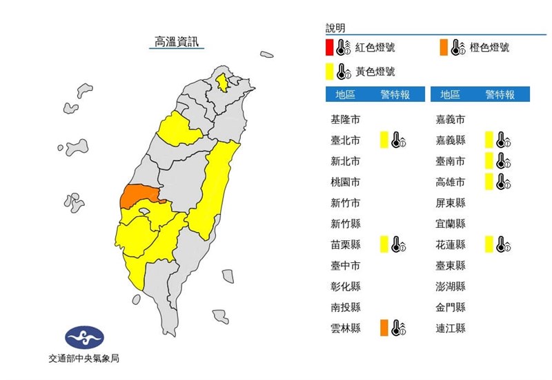氣象局指出,今天中午前後雲林縣為橙色燈號,有連續出現攝氏36度高溫的機率,台北市、苗栗縣、嘉義縣、台南市、高雄市、花蓮縣為黃色燈號,氣溫也可能達36度,其他地區高溫約32至35度。