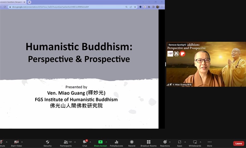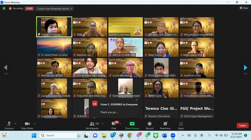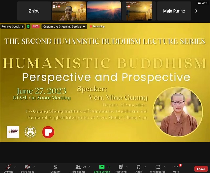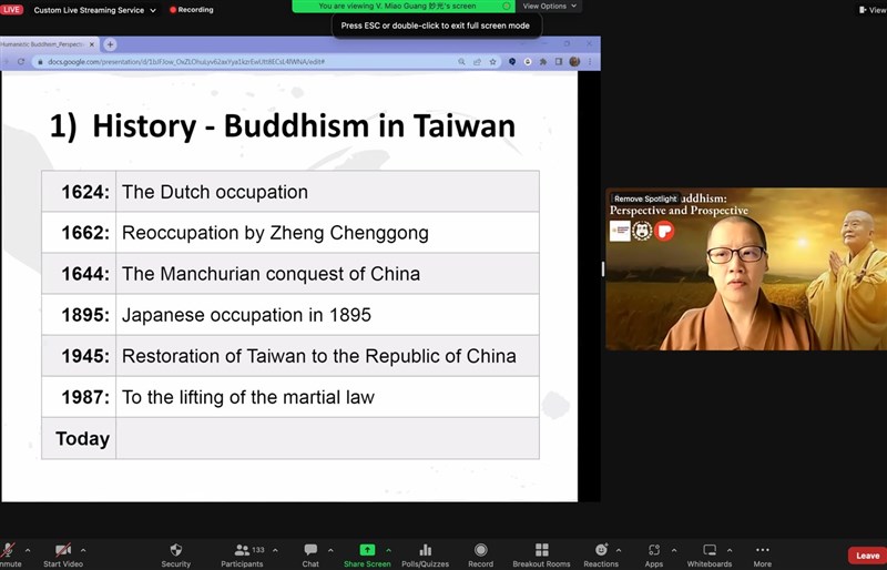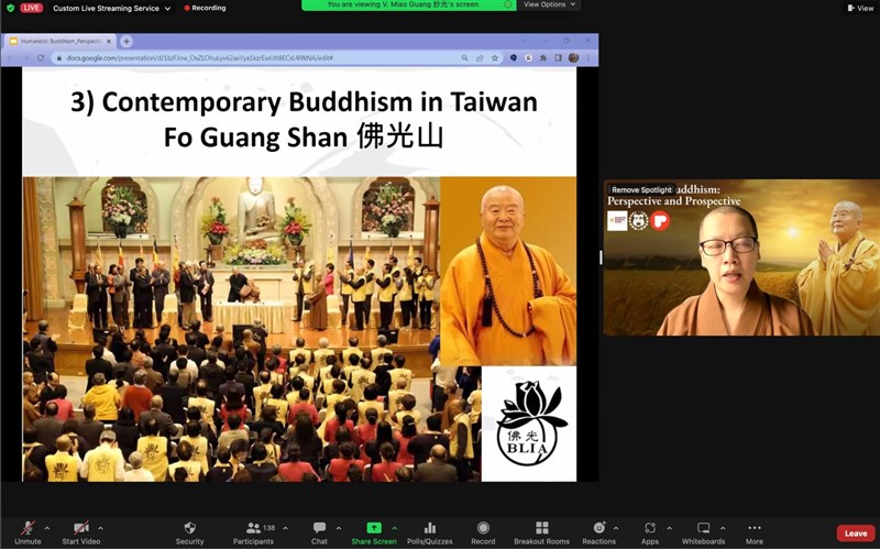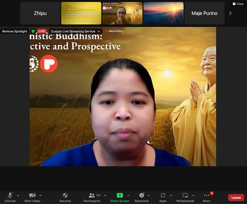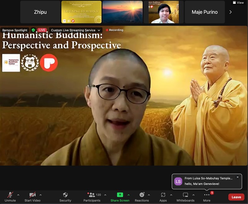 Online participant named Glydel Grace Baya, points out the way for Buddhism community to deal with others’ misconception is not to participating for a sense of peace with Right view; Genevieve Balance Kupang appreciates the historical background of Humanistic Buddhism in Taiwan, integration of the colonists, emergence of Buddhist generational leaders to revolutionized from the corrupted understanding to humanistic Buddhism today.