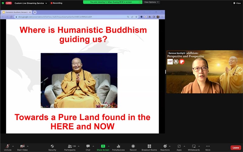 The Abbess of Fo Guang Shan(FGS)Mabuhay Temple and Director of HBC, Ven. Miao Jing delivered her opening remarks that although we come from different backgrounds but we come online because of a special affinity with Venerable Master Hsing Yun (VMHY). We practice Three Acts of Goodness, Four Givings to transcend moments of ignorance into enlightenment, negativity into positivity to purify body and mind; to fill our life with compassion and patience.