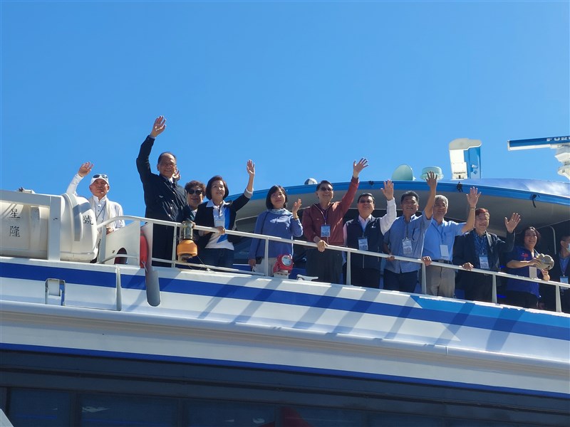 游錫堃今早9時許與交通部觀光局長張錫聰、宜蘭縣長林姿妙等中央地方各部會人士,以及全國各地觀光業者共90多人,從蘇澳港出發前往與那國島。圖/陳敬丰