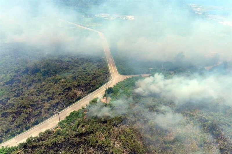 台東綠島觀音洞後方和牛頭山間的私有停耕地,4日2度發生火警,目前持續燃燒中,已申請內政部空中勤務總隊直升機前往協助滅火。圖/台東林管處提供